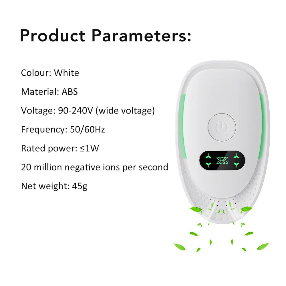 Ten miniaturowy oczyszczacz powietrza uwalnia 20 milionów jonów ujemnych na sekundę , neutralizując zapachy i zanieczyszczenia powietrza, zapewniając czystsze i świeższe powietrze w pomieszczeniach. Zaprojektowany do pracy ciągłej , cicho oczyszcza powietrze bez filtrów i konserwacji.