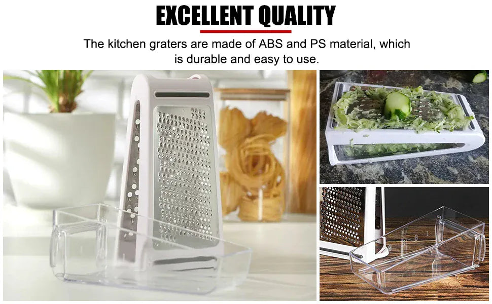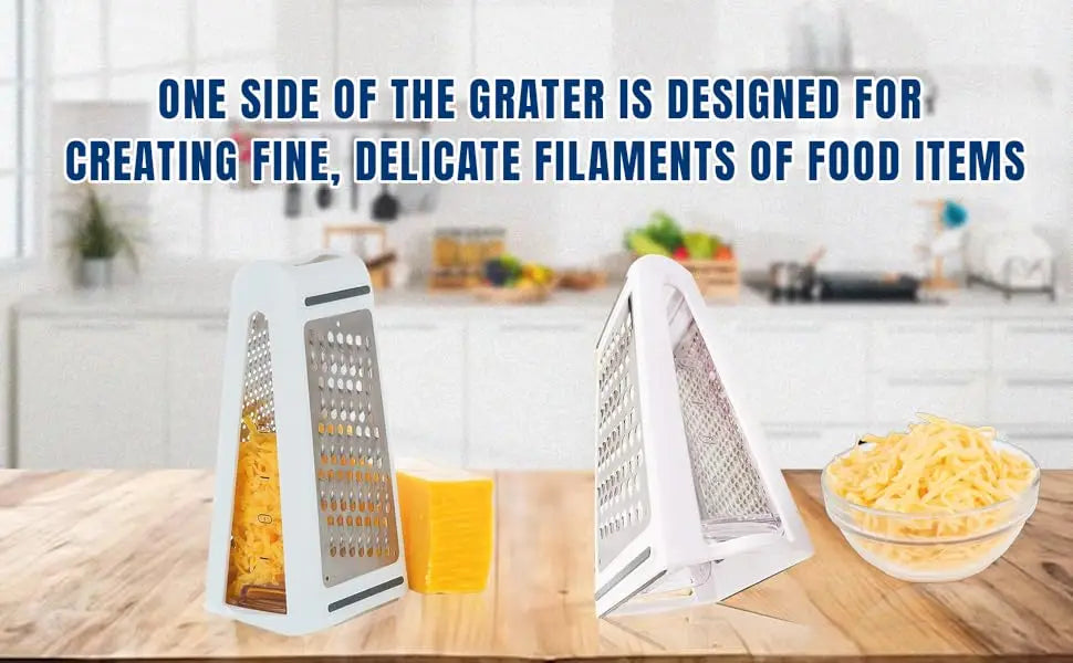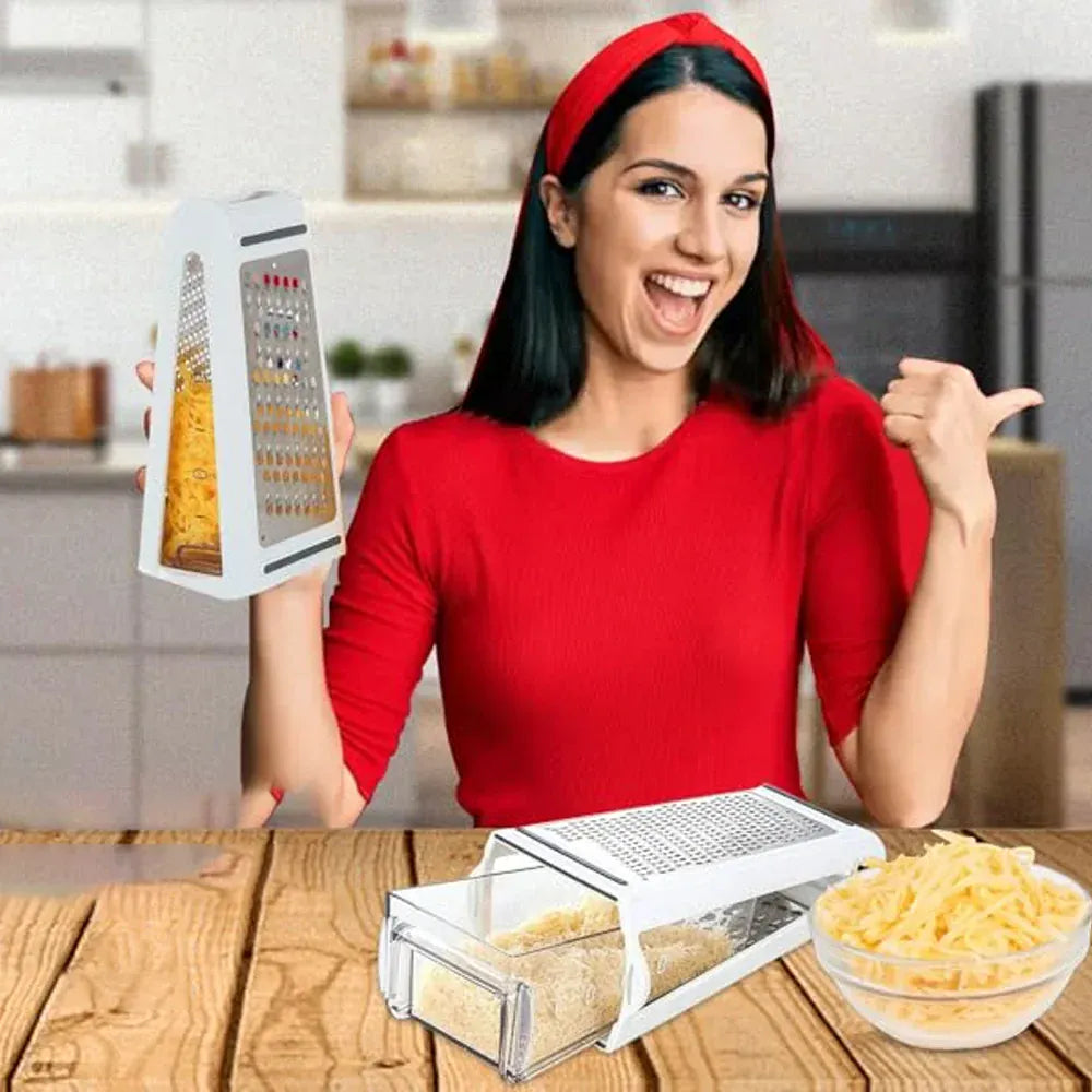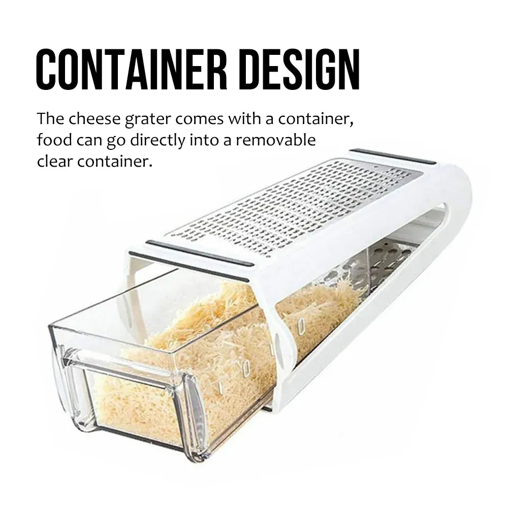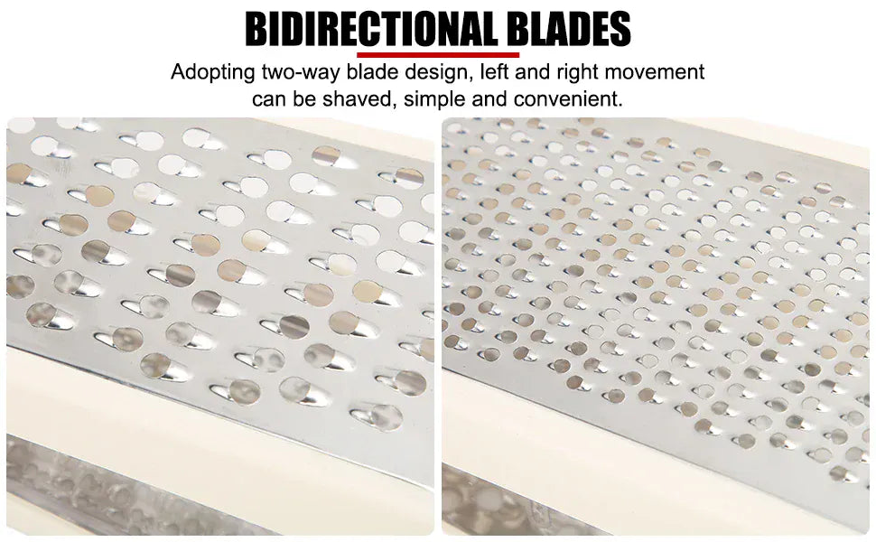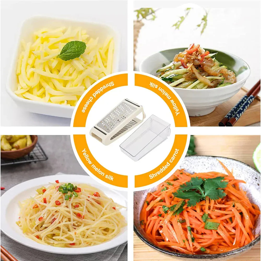Ta dwustronna tarka do sera ze stali nierdzewnej z pojemnikiem do przechowywania umożliwia łatwe krojenie, szatkowanie i ścieranie ulubionych składników.