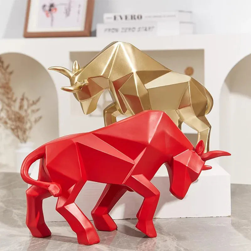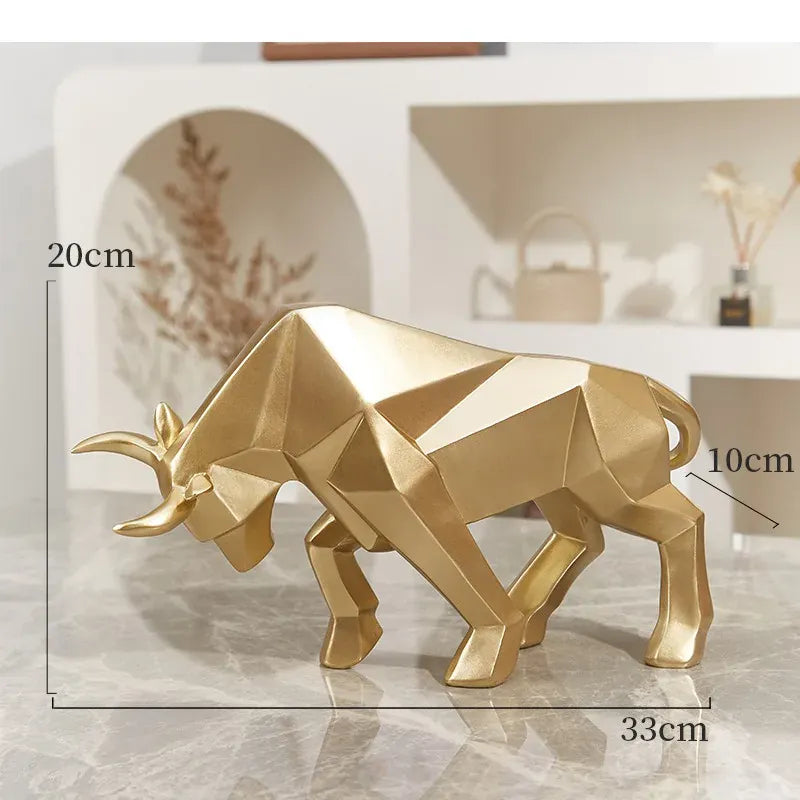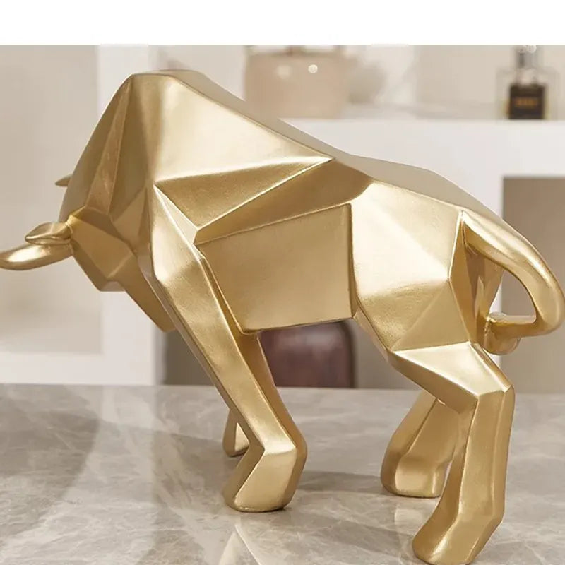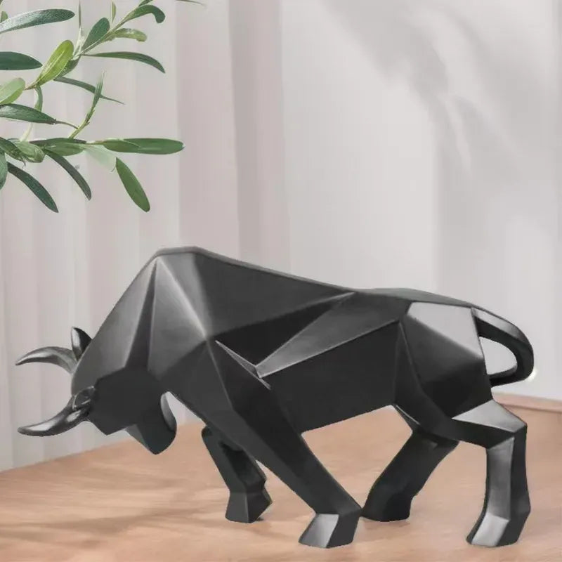 Dodaj siły i stylu każdej przestrzeni dzięki tej żywicznej figurze byka – nowoczesnej abstrakcyjnej rzeźbie symbolizującej siłę, sukces i pewność siebie. Idealna do salonów, biur i jako prezent dla inwestorów lub handlowców .