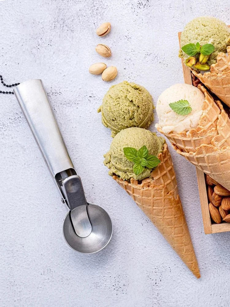 Łyżka do lodów ze stali nierdzewnej z spustem, uchwytem zapobiegającym zamarzaniu, idealna do lodów, mrożonego jogurtu i deserów lodowych